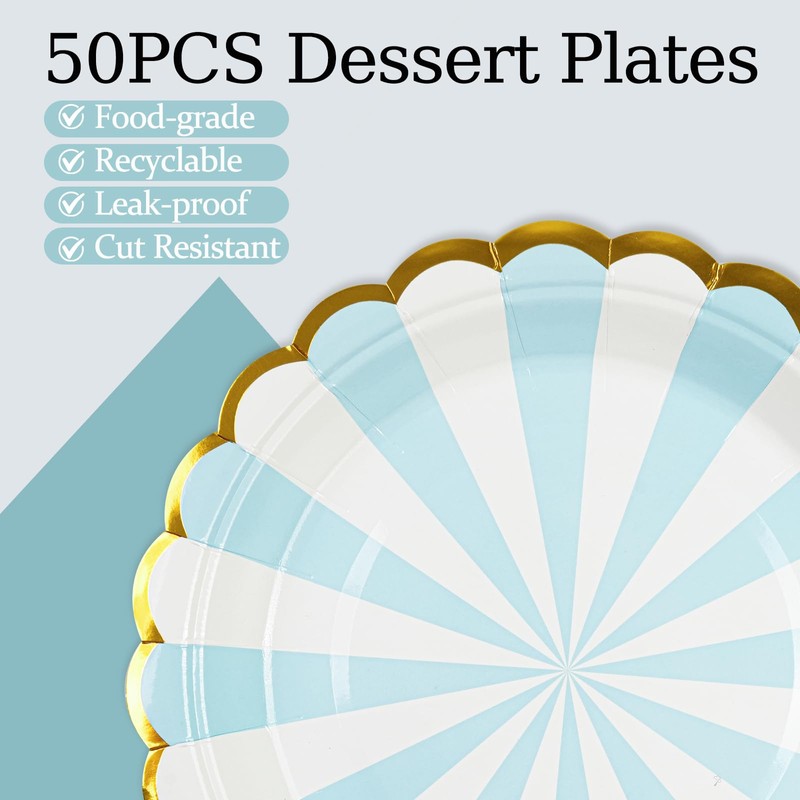 - 【Chic Stripe Design】 The soft blue hue and clean stripe pattern with charming gold foil scalloped edges add a modern, festive touch to any table setting. Ideal for weddings, tea parties, or family dinners, these plates elevate your event with effortless style.