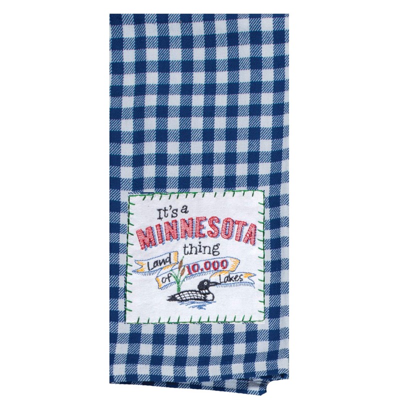 - The coordinating blue and white plaid tea towel features a stitched panel with a 10,000 lakes and duck design and the sentiment 'It's a Minnesota thing."
