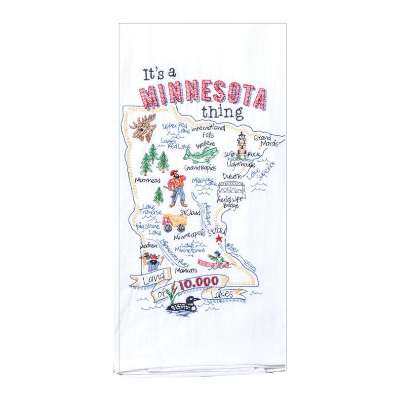 - A vibrant Minnesota-themed flour sack towel with embroidered state outline featuring the sentiment 'It's a Minnesota thing." Some of the highlights within the design are the Land of 10,000 Lakes, Aerial Lift Bridge, Madison and International Falls.