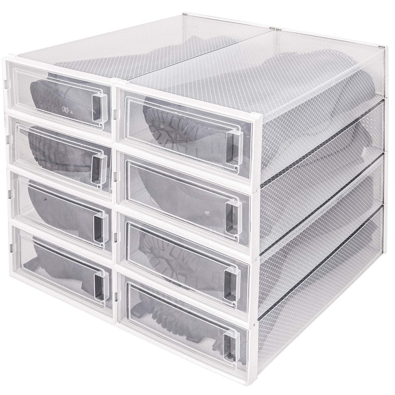 Stackable boot boxes for tall boot: The four clips above the storage boot box is used for product stacking, they stack on top of each other, very stable and not easy to fall. It help you save space and give you a unique shoes wall.