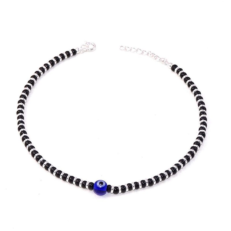 DHRUVS COLLECTION 925 Silver Evil Eye Nazariya Anklet with Black & Silver Crystal Beads For Women - One Piece