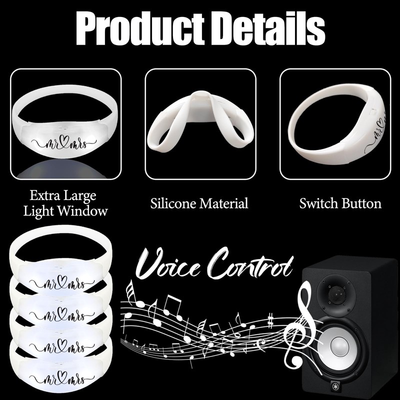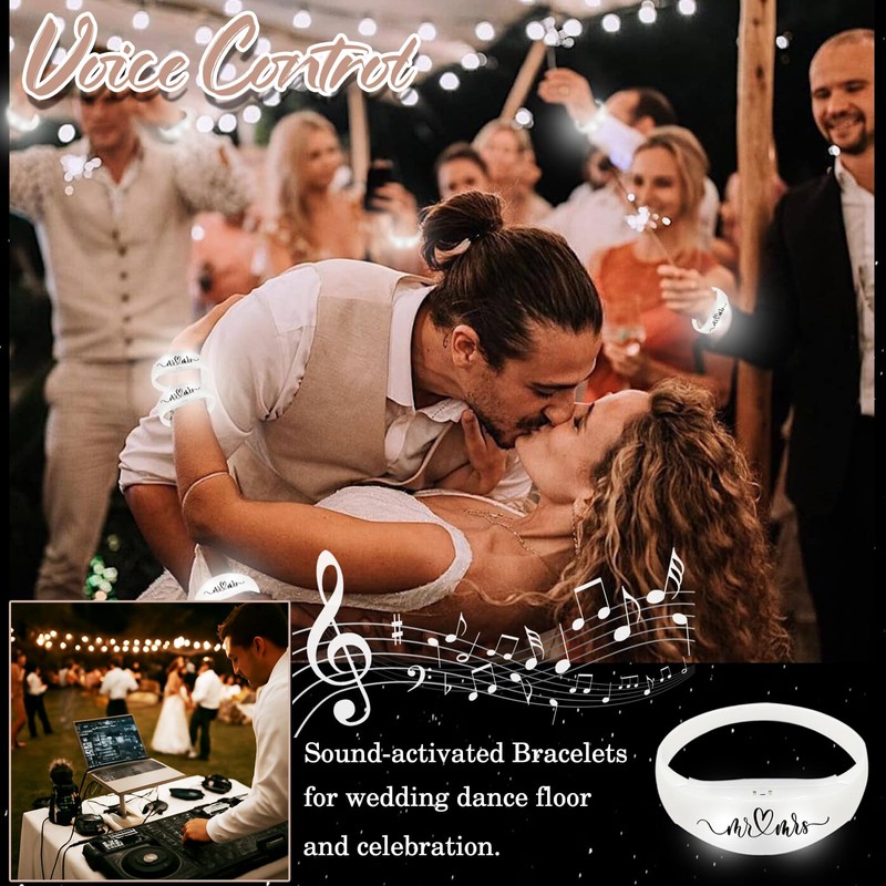 - Wedding Theme Design: Each of these sound activated light up bracelets is meticulously printed with "Mr&Mrs" text, allowing the romantic declaration to shine brilliantly at all times. Custom-designed for newlyweds, it adds deeper commemorative meaning to the celebration.