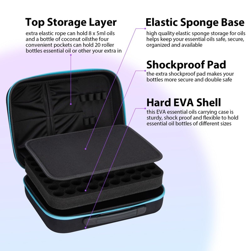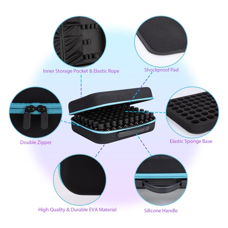 • 【Durable Material】 Essential oil organizer is made of hard EVA material, sturdy, shockproof and flexible to hold various bottle sizes, the hard shell exterior protects bottles from water and sunlight while traveling or storing.