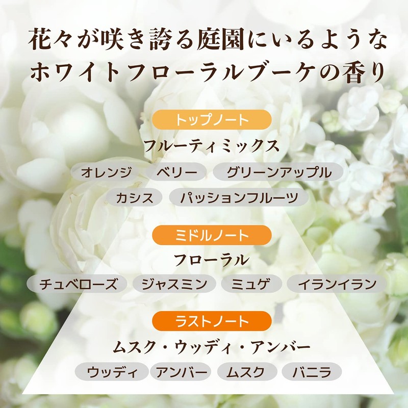- ✔【Scent of a white floral bouquet like in a blooming garden】 The striking harmony of white flowers such as jasmine, tubelrose, and other white flowers with acidic fruits and sweetness spreads into your bathroom. A fragrant and luxurious white floral bouquet fragrance