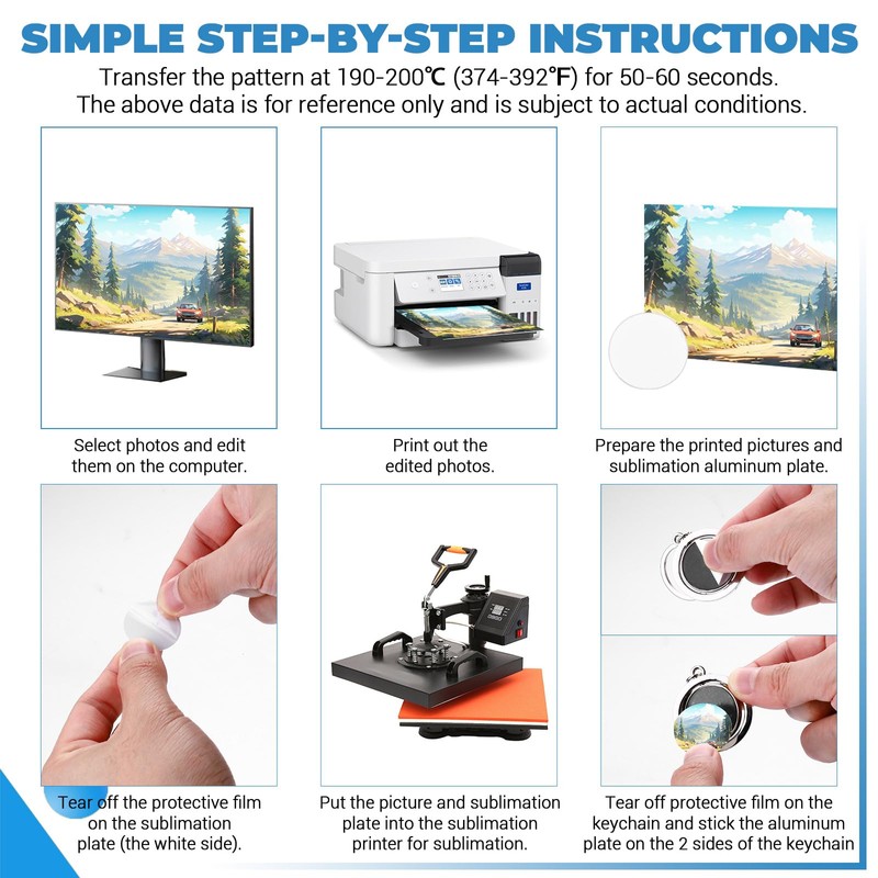 - Easy to Sublimate: Please remove the protective film on the surface of the aluminum plate (white surface) before sublimation. Time and temperature 190-200℃ (374-392℉) for 50-60 seconds, data is for reference only. After finished, tear off the protective film on the blank keychains and stick aluminum plates on the both sides of keychain