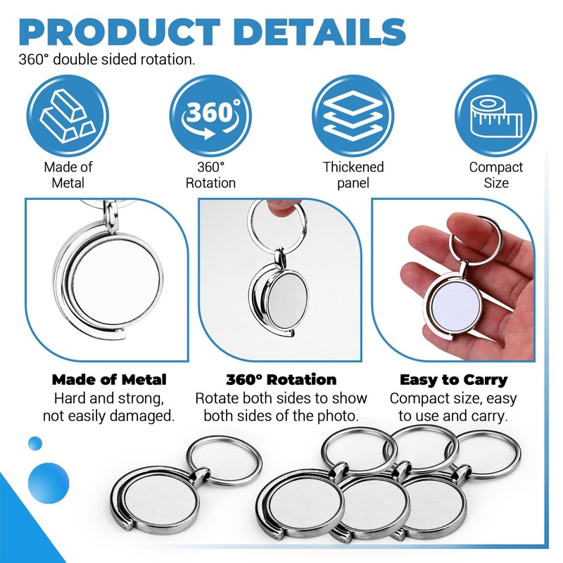 - 360° Rotatable & Double-sided: The round coin in the middle of the DIY keychain can be rotated 360 degrees left or right to show the photos on both sides, which is very creative