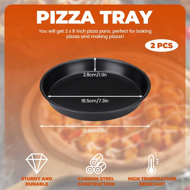- 2-Piece Round Pizza Pan Set: Includes dual 8 inch pizza pans (21.5cm/8in outer diameter and 18.5cm/7.3in inner diameter) with 1.1-inch (2.8cm) depth. Perfect for baking pizza or using as a take and bake pizza plate. Stackable design saves storage space