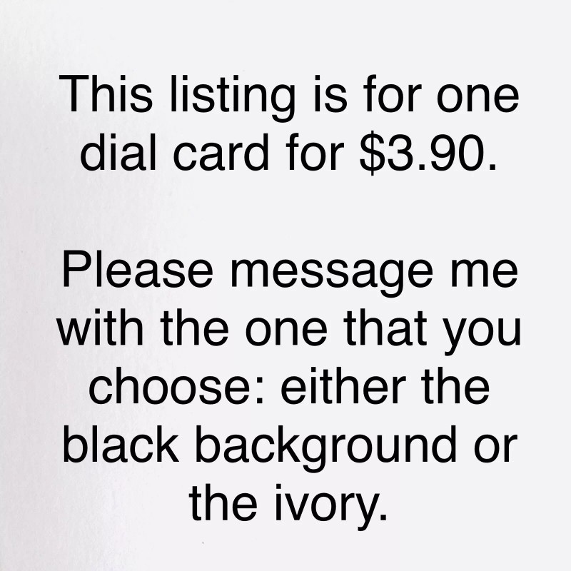 Ever wonder where you can get a new replacement paper dial card disc insert for your vintage rotary telephone? Look no further! Listing is for ONE DIAL CARD INSERT “Wait for Dial Tone” 1.5” diameter (38mm) Choose either black or ivory background. On buff/ ivory card stock paper (65-lb), with a notch. Fits inside the plastic finger rotary telephone wheel dial, or in metal rotary telephone center dial that is 1.5" Message me on which one you want: black or ivory.