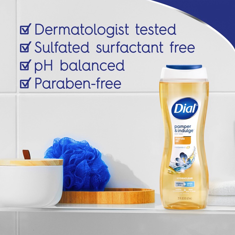 Dial Pamper & Indulge Marula Oil body wash. Delight your senses with a decadent marula oil-infused experience. Dial? HYDRACLEAN Complex? feels deeply cleansing while being gentle on your skin, leaving it feeling soft & healthy. Dermatologist tested & approved under the Leaping Bunny cruelty free program. This package contains 32 fluid ounces of Dial body wash.
