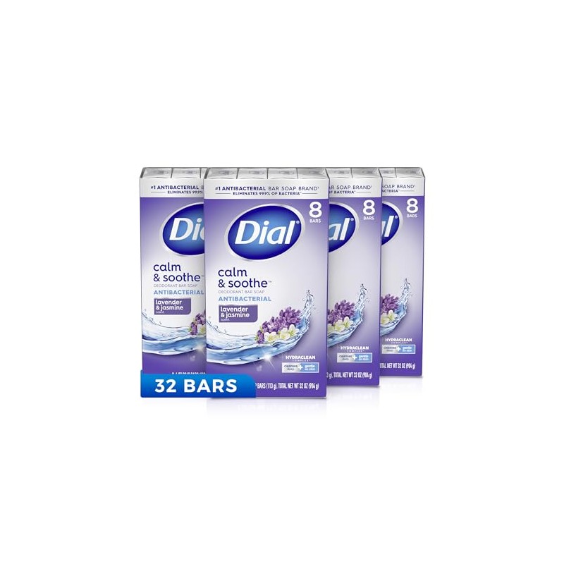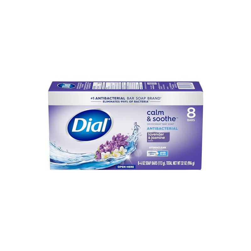 Calm & Soothe Lavender & Jasmine Antibacterial Bar Soap. Unwind with the scent of Lavender & Jasmine and transport yourself to a calming place. Dial HYDRACLEAN Complex cleanses deep while being gentle on your skin, leaving it feeling soft & healthy. Dermatologist tested & approved under the Leaping Bunny cruelty free program.