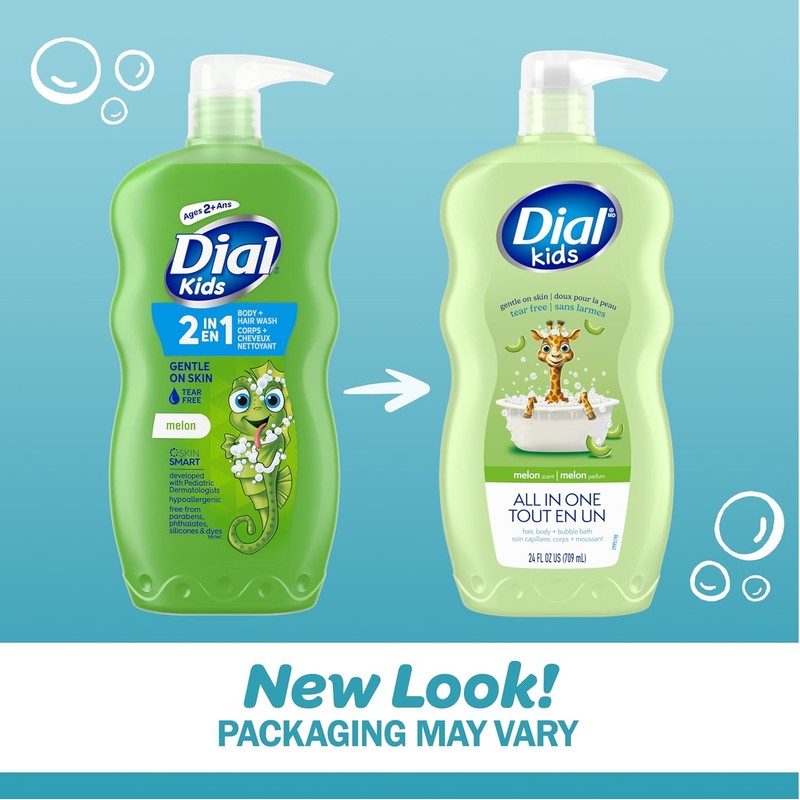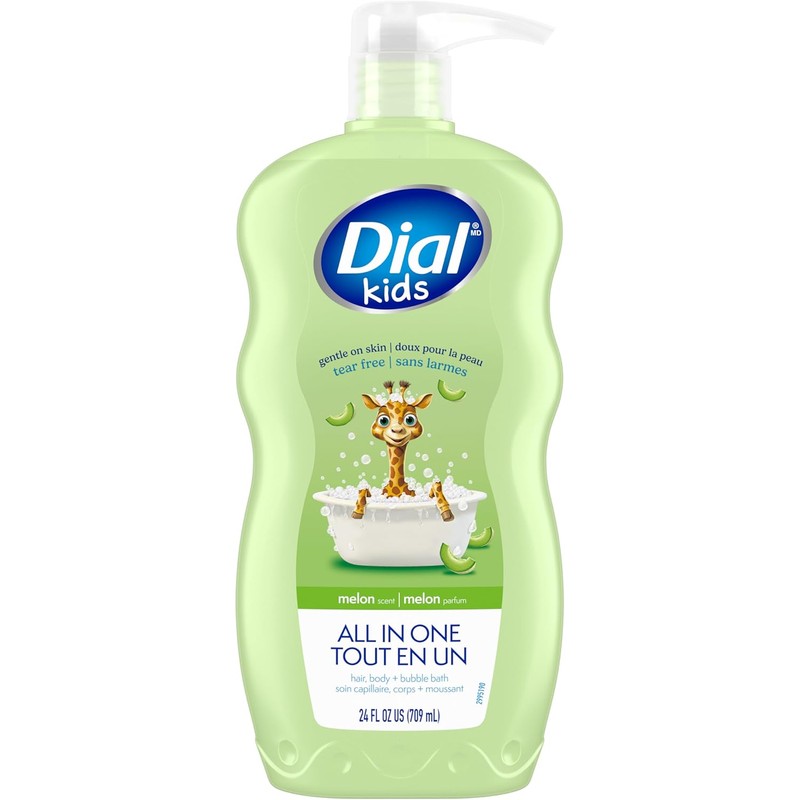Dial Melon Scent Kids Body Wash will leave your little one's skin feeling soft and smooth. Made with parents in mind, this is an all in one hair, body wash, and bubble bath that is gentle on skin, tear free and will make bath time fun. Tested by pediatric dermatologists, it's hypoallergenic and free from parabens, phthalates, and silicones. Feel good about this kids body wash, knowing it's safe and gentle for every kid from the top of their heads to their tippy toes. Approved as cruelty free under the Leaping Bunny Program. Dial kids body wash bottles are 100% recyclable, BPA free and made from 50% post-consumer recycled plastics (excluding pumps). This package contains 709ml of Dial Kids All in One Body Wash.