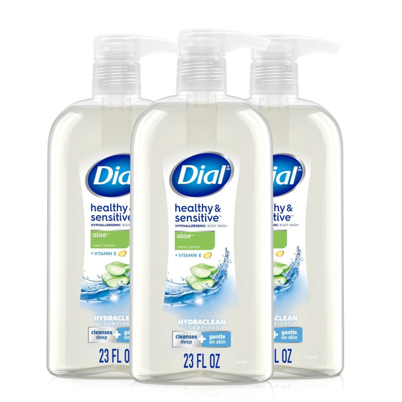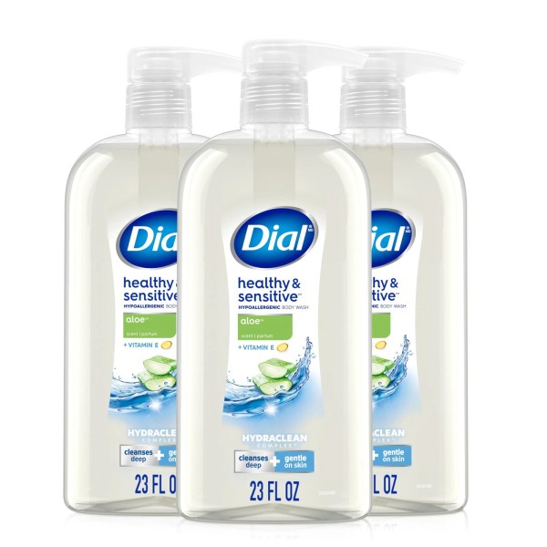 - CLEANSES DEEP: Care for your sensitive skin with a hypoallergenic formula made without dyes and with gentle ingredients. This Dial Body Wash is tough on dirt and impurities yet gentle, and is for all skin types. 23 Fl Oz bottle (Pack of 3) in refreshing Aloe scent.