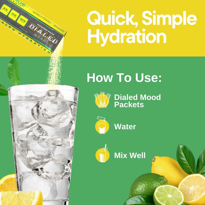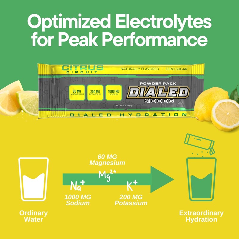Dialed Moods Citrus Circuit is a zesty electrolyte powder designed to provide clean hydration without added sugars. The tangy citrus flavor delivers a refreshing hydration experience, perfect for those looking to replenish lost electrolytes after a workout or during a busy day. Made with natural ingredients, this electrolyte drink mix is sugar-free, vegan, and keto-friendly, providing hydration that fits into various dietary lifestyles.Each packet contains a balanced blend of essential electrolytes like sodium, potassium, and magnesium to support hydration and muscle function. Whether you're engaging in high-intensity exercise, training for endurance events, or simply staying active, Citrus Circuit helps restore electrolyte levels and keep you performing at your best.The convenient single-serve packets are designed for easy, on-the-go hydration. Just mix a packet with water to stay hydrated during your workout, after sports, or anytime you need a refreshing electrolyte boost. With no artificial ingredients or added sugarsKey Benefits of Dialed Moods Electrolyte Powder Essential Electrolyte Replenishment: Helps restore critical electrolytes lost through sweat, supporting hydration, endurance, and recovery during workouts or daily activities.Sugar-Free & Clean Formula: Made without added sugars or artificial sweeteners, Dialed Moods provides a clean hydration solution suitable for keto and low-carb diets.Vegan & Keto-Friendly: Ideal for athletes and health-conscious consumers following plant-based or ketogenic lifestyles, with natural ingredients that fit seamlessly into your diet.Convenient On-the-Go Packets: Easy-to-use, single-serve packets make it simple to stay hydrated wherever you are—whether at the gym, outdoors, or on the move.Delicious Flavor Options: Available in a variety of refreshing flavors to suit your taste, ensuring hydration is enjoyable and satisfying with every sip.