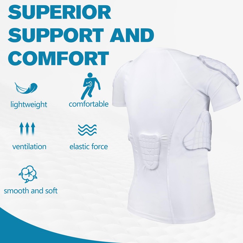 - Anti-Impact: The football protective gear padded shirt is made of 6-pads half-inch thick high-density EVA foam, which is lightweight and flexible, with excellent shock resistance.Provides long-lasting protection for your chest, shoulders, ribs, heart, sternum, and more