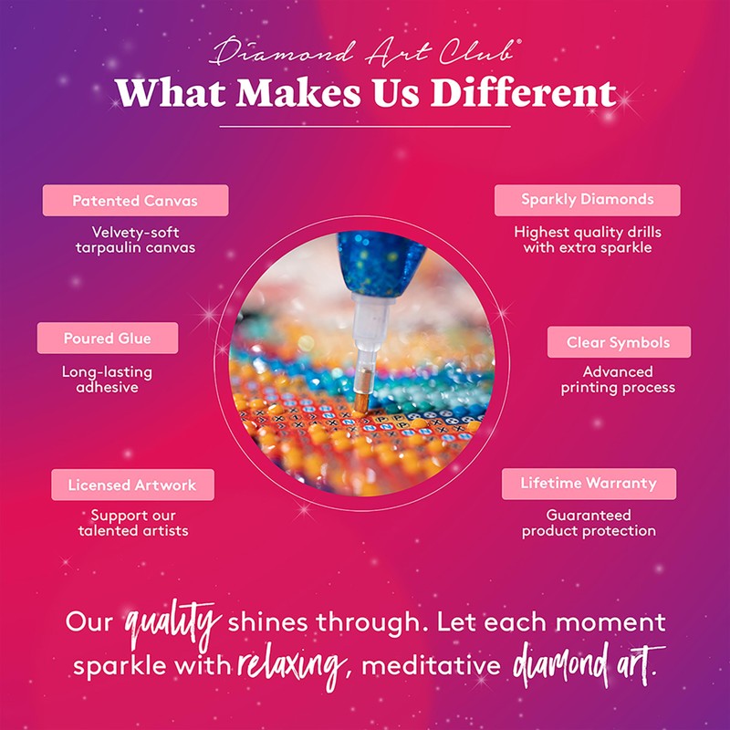 Our paintings are officially licensed, making our canvas selection unparalleled. It features popular characters, animals, and more to inspire creative fun for all! Each diamond art kit is great to work on alone or with a group of friends. Once finished, frame your finished artwork as home decor or gift it to a loved one. Diamond Art Club kits also make perfect craft-station activities. They require little effort and are mess-free, making them easy and fun crafts for friends, especially those who love puzzles, crocheting, and art projects!
