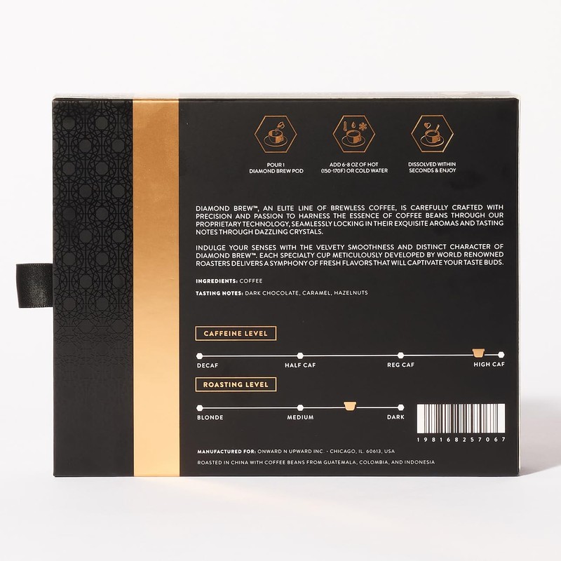 - FULLY RECYCLABLE PACKAGING & UPCYCLED GROUNDS: Diamond Brew is environmentally conscious. Not only is our packaging fully recyclable, including the outside paper box to aluminum pods insides, our roasted ground coffee is also upcycled to companies, like IKEA, that will turn it into furniture.