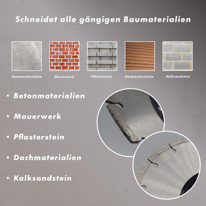Our diamond cutting discs are the optimal choice for professional use. The universal diamond cutting disc with high-quality 10 mm block segment allows precise cuts through a wide range of building materials such as concrete, stone, natural stone, granite, paving stones, masonry and bricks.