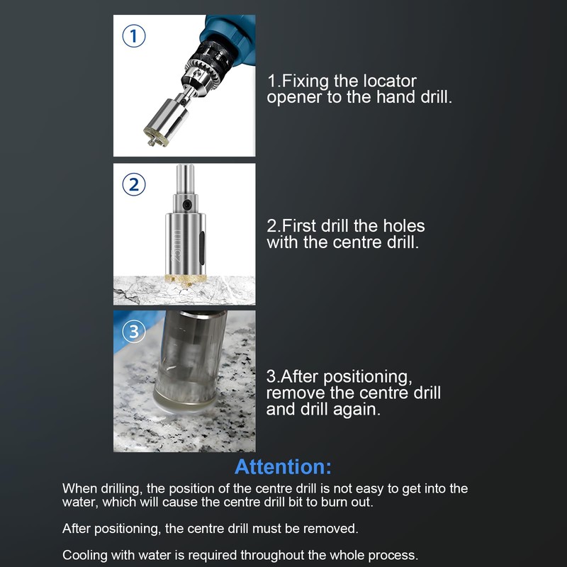 - 【Instructions for use】: Keep drilling vertically, when a round slot is drilled, you can remove the centring tip and continue drilling. Keep the RPM 500-800 and use water to keep it cooling for last long.