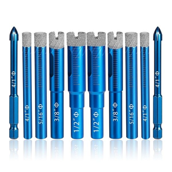 Diamond Drill Bits Set 8PC and 2PC 4-Edge Cross Drill for Versatile Ceramic Drill bit Granite, Hard Tiles Marble, Masonry, Concrete, Glass, Dry Precise Drilling
