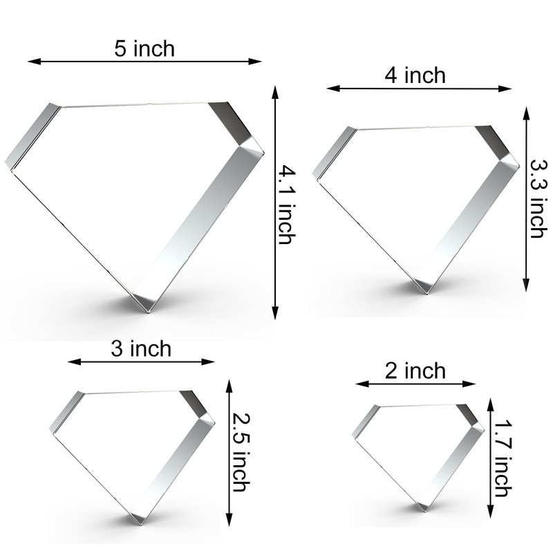 - 4 PIECE DIAMOND CUTTER SHAPES SET: Biscuit cutters kit including diamond jewel gemstone shapes molds in 4 different sizes ( 5", 4", 3", 2" ). Perfect for upcoming wedding, bridal shower or engagement party.