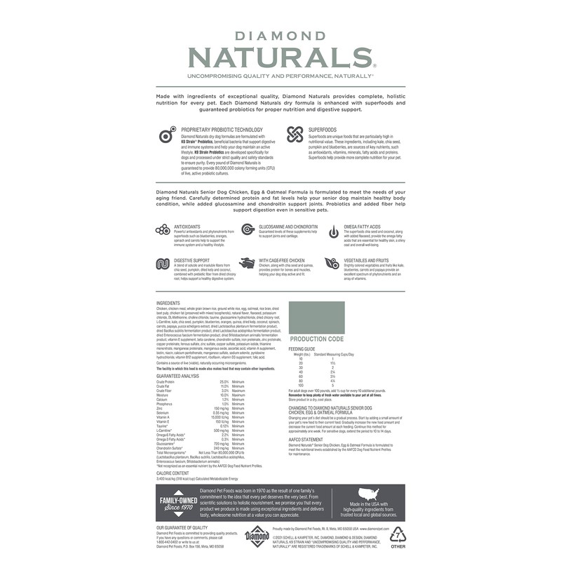 Made with ingredients of exceptional quality, Diamond Naturals provides complete, holistic nutrition for every pet. Each Diamond Naturals dry formula is enhanced with superfoods and guaranteed probiotics, for optimal nutrition and digestive support. Diamond Naturals Senior Dog Chicken, Egg and Oatmeal Formula is formulated to meet the needs of your aging friend. Optimal protein and fat levels help your senior dog maintain ideal body condition, while added glucosamine and chondroitin support joints. Probiotics and added fiber help support digestion even in sensitive pets.