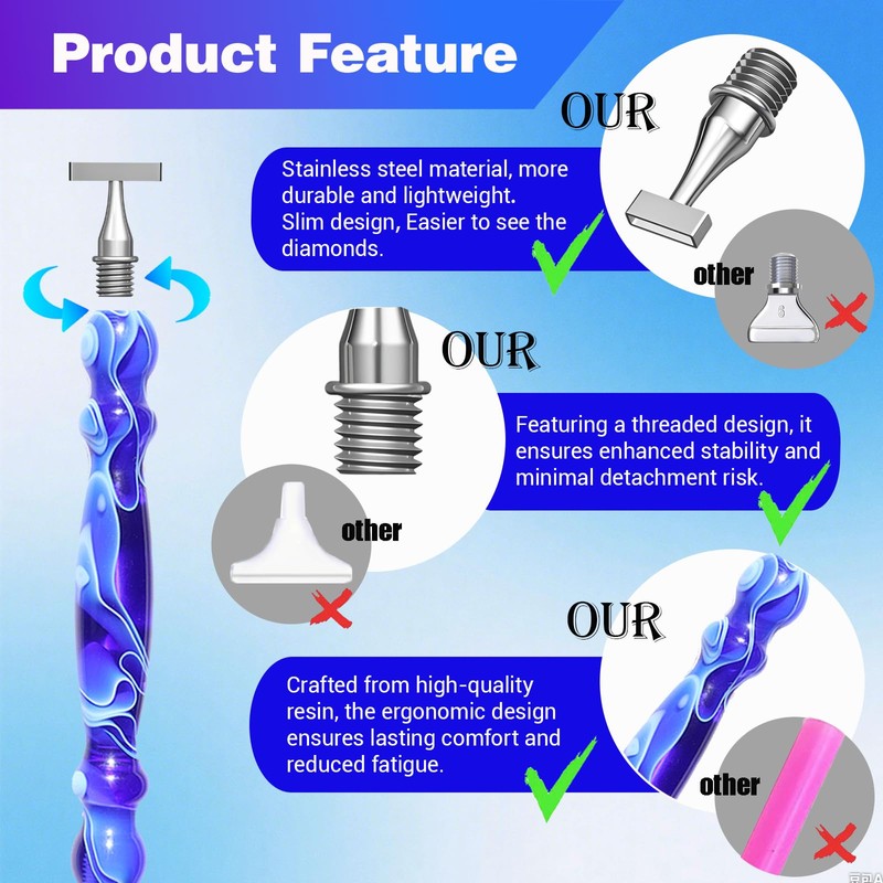 - 【Ultra-Precision Diamond Painting Pen】 The diamond painting accessories are specially designed for professionals. These ultra-thin stainless steel tips can handle the tiniest diamonds with ease. The ultra-thin edges enable our diamond painting tool to be easily visible, providing a clear and flawless view of the diamonds - achieving precise positioning.