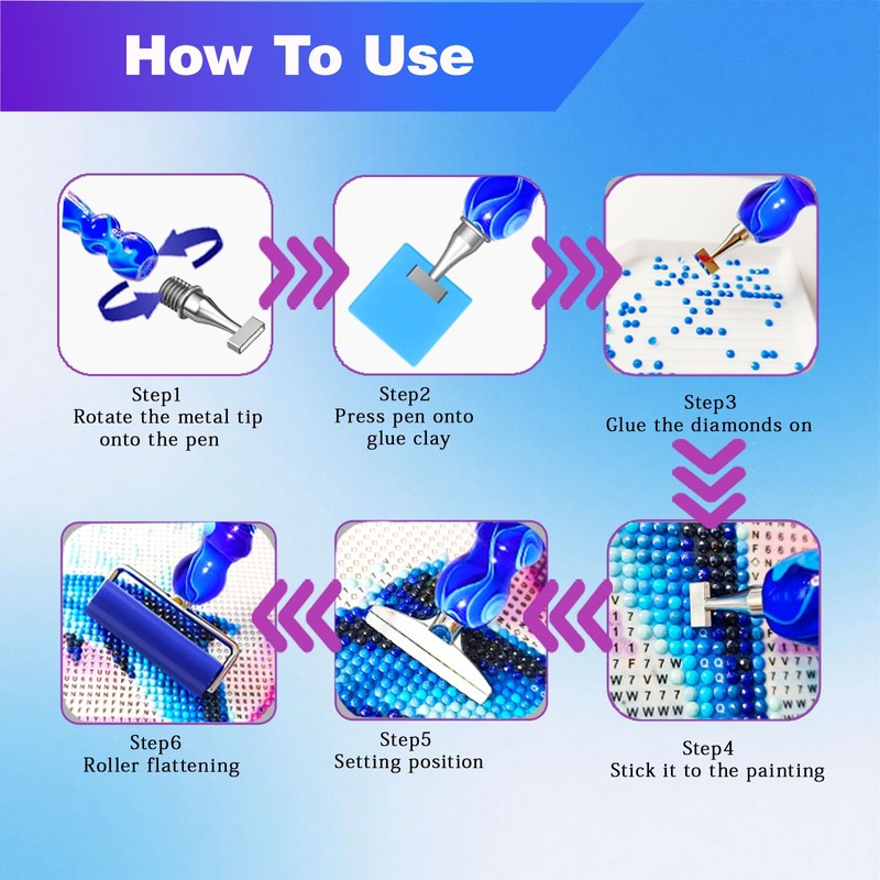 - 【Replacements for Continuous Use include】 Include1pcs diamond painting pen ,3 types of diamond tips (1/3/6 ), 1*diamond painting roller,1* Correction tip,brush, 6 pieces of Glue wax,and a storage box.