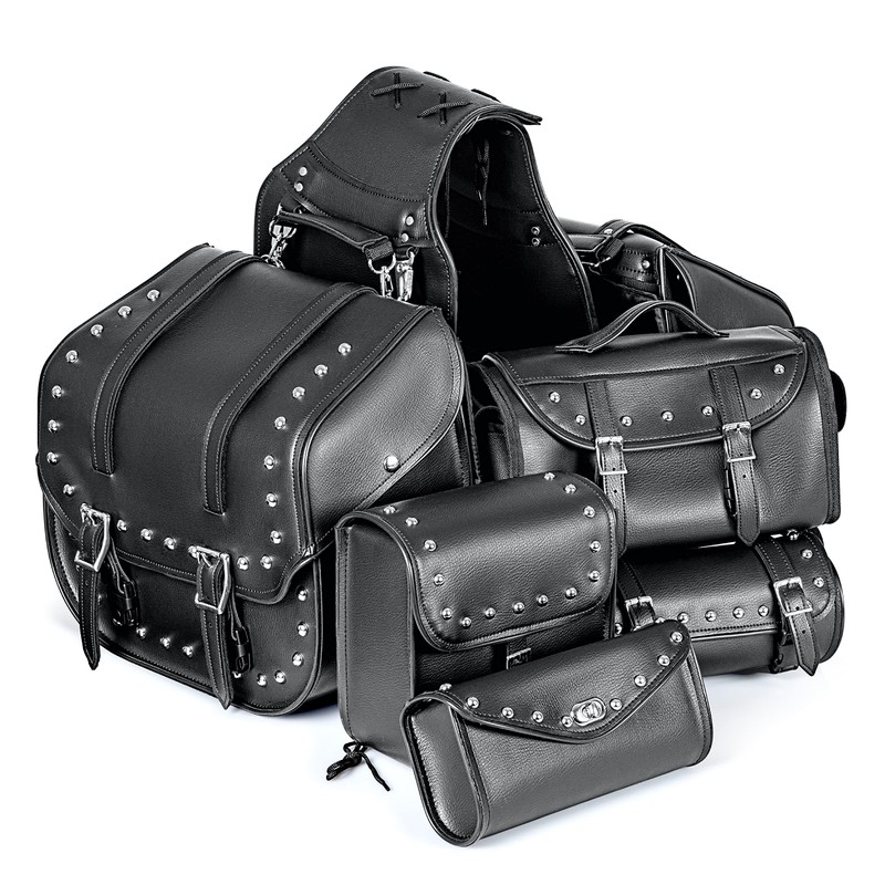 - The 6 piece bag set includes windshield bag, sissy bar bag, tool bag, barrel bag, and two 14-1/2" x 12-1/2" x 7-5/8" saddlebags