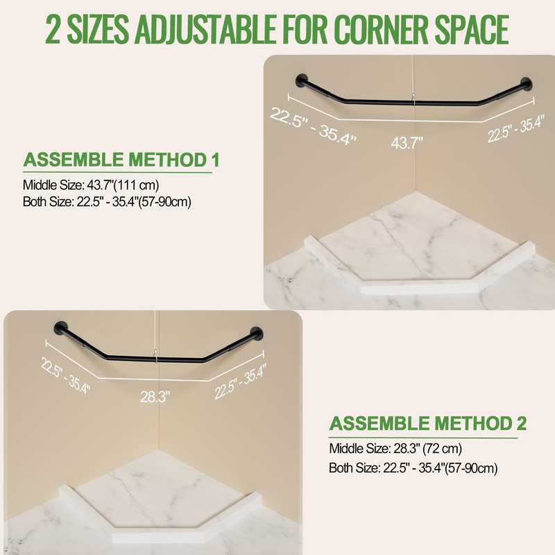- Easy to Install and Adjustable Size Design: Specially designed for corner space, two methods to install this diamond shaped shower curtain rod. (1) both sides: 22.5"-35.4", middle: 28.3"; (2) both sides: 22.5"-35.4", middle: 43.7"