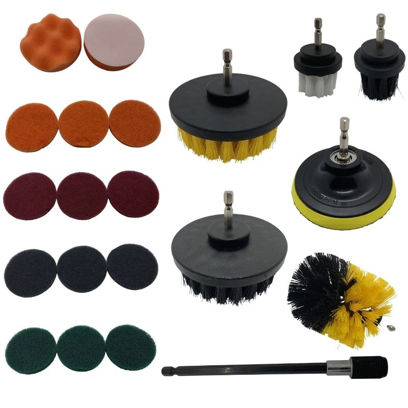 5 - Heavy Duty Power Scrub Brushes White - 2" Soft Bristle - Carpet, Glass and other gentle Scrubbing Yellow - 4" Medium Bristle - Tile and Grout, Fiberglass Showers, Siding Black - 2" Medium Bristle - Linoleum, General Purpose Cleaning - Brick, Stone, Fireplace, Loose Paint and Rust removal Black - 4" Hard Bristle - Stripping of loose paint, heavy-duty de-scaling, mortar Black & Yellow - 3.5" Medium Bristle Dome Shaped - Ideal for toilet bowls 12- Souring Pads (3) Orange / Soft - Polishing Glass, Light Scrubbing, and Plastic Cleaning (3) Red / Medium - Fiberglass Scrubbing, Stainless Steel, and Chrome (3) Black / Firm - Metal cooking utensils and Equipment, Pans and Skillets (3) Green / Aggressive - Heavy Duty and Harsh Scrubbing Conditions (1) Scrub Pad Adapter (hook & Loop) (2)- Sponges Flat Sponge - Gentle cleaning, polishing, Dishes, Designed For Flat Surfaces Contoured Sponge - Gentle Cleaning, Polishing, Designed for Curved Areas (1) 6" Drill Adapter With Quick Release Fits all standard electric and battery operated drills *Dirll not included