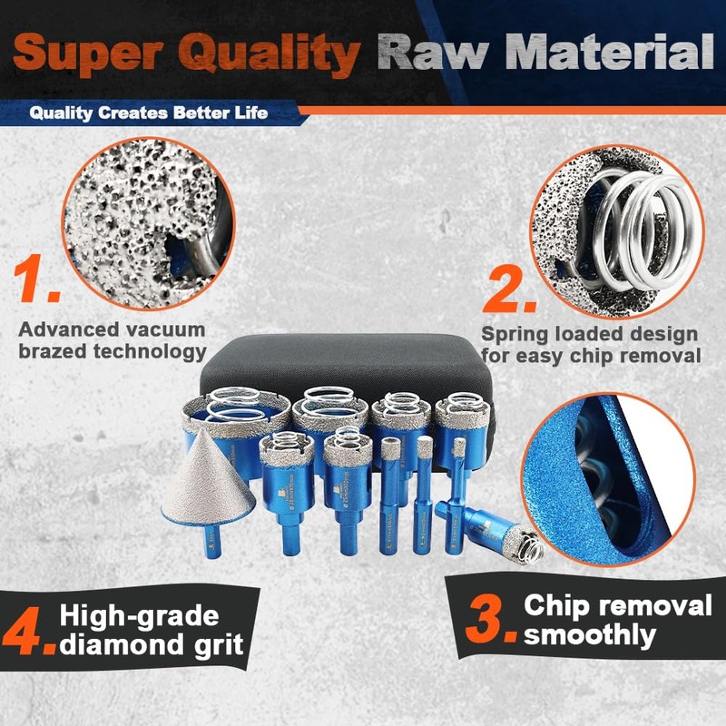 - Our Diamond Hole Saw kit is Made of Diamond Monolithic Steel, Which is Strong and Durable. The Surface is Made of High Anti-Corrosion Brazing Process, and the Thickened Diamond Coating on the Top Has Excellent Cutting Strength for High Precision and Smooth Cutting, Stable, Fast and Durable Drilling.