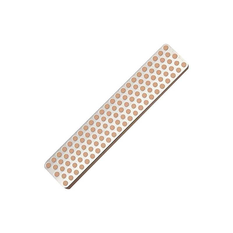 Tan, extra fine grit. Measures 4 3/8" x 7/8". Fits DMT Aligner Knife Sharpening Kits. Hang packaged.
