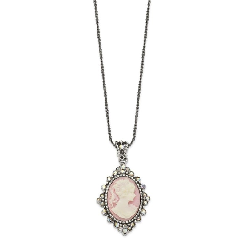 - PREMIUM QUALITY -:Sterling Silver Antiqued Pink Resin Cameo Crystal Necklace, Elegantly Crafted in Highest Quality for Luxurious Shine and Feel.