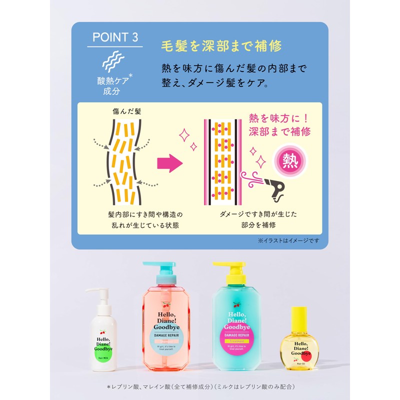- High-damage repair treatment oil formulated with acid heat care ingredients. For moisturizing, shining, and ribbing care