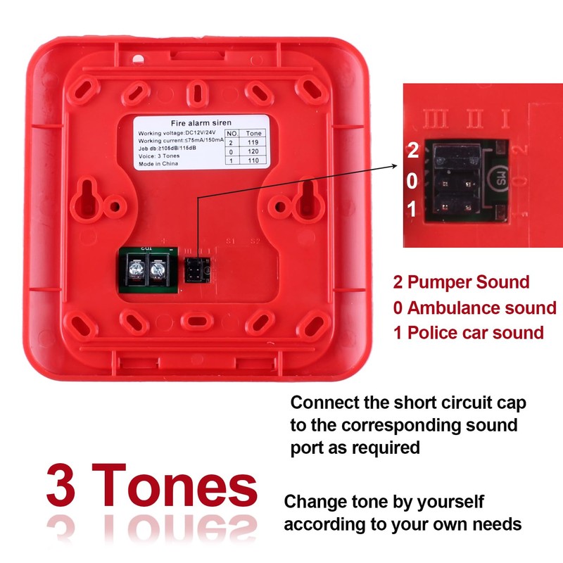 - 【SOUND】: Lound Sound reaches 110DB at 24VDC. There are three different tones you can change by yourself