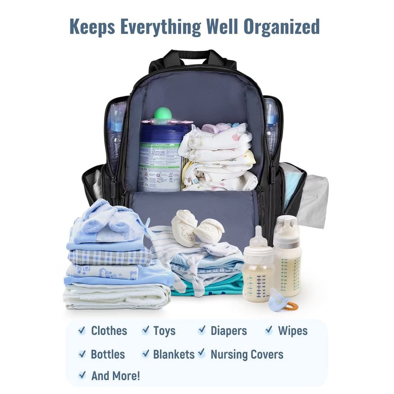 - Designed for Convenience - Extra wide opening makes this diaper backpack easy to find essentials in a pinch, and sturdy zippers for easy-access and closure even with one hand! Reach out single-handed to side slot for baby wipes. Easy-grab handle, back ergonomic design and thick padded shoulder straps offer you a comfortable carrying and force reinforcement
