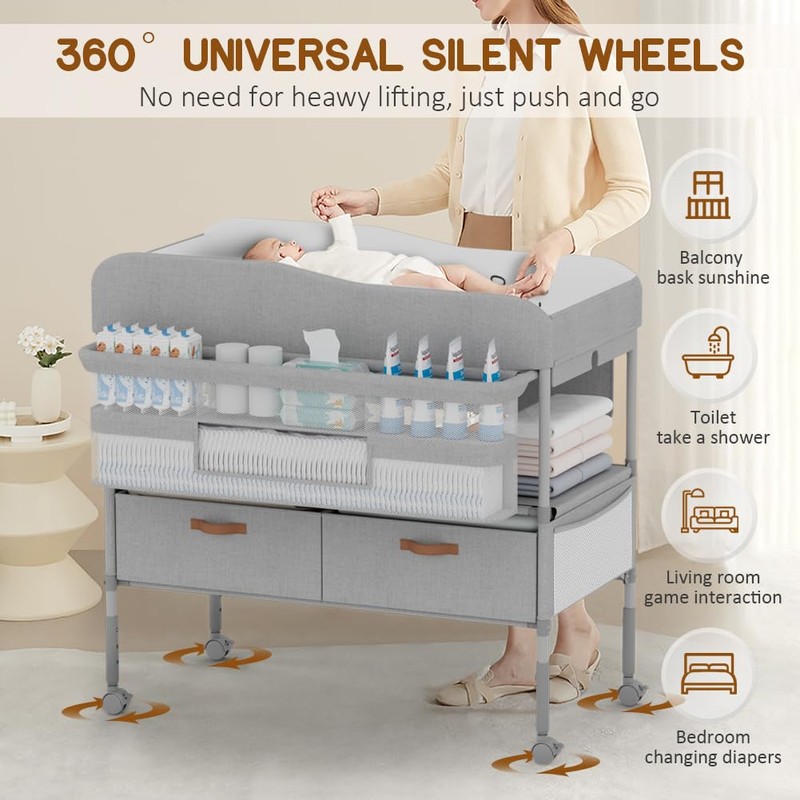 • 📏[WHEELS AND SCALE DESIGN] Equipped with 4 smooth wheels which allow the changing station for nursery to easily and quietly move from room to room and no need for bulky handling, the 4 wheels have a locking function, when you need it to stay still, you just need to press the locking mechanism lightly. The scale on the diapery table is more convenient for you to watch your baby's growth.