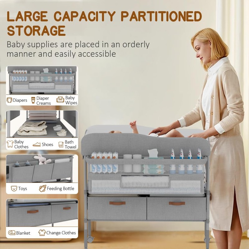 • 🧺[UNBELIEVABLE STORAGE SPACE] The diaper changing station is designed to provide ultimate convenience and organization. It is equipped with 2 large capacity drawers with handles to store baby clothes and blankets, 2 storage shelves suitable for placing baby shoes and towels. 2 front and rear mesh pockets for storing baby toys and bottles. 6 side hanging bags for storing baby wipes and diaper creams, allowing you to wipe with one hand. The additional large diaper storage bag for faster and easier diaper changing and never in a mad rush.