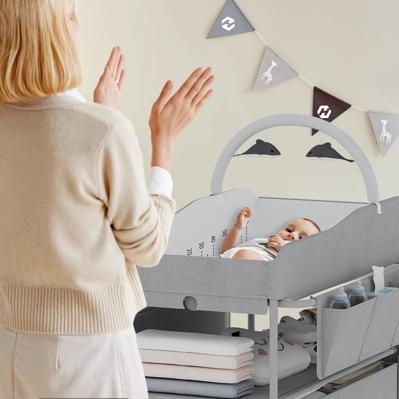 - 🧺[UNBELIEVABLE STORAGE SPACE] The diaper changing station is designed to provide ultimate convenience and organization. It is equipped with 2 large capacity drawers with handles to store baby clothes and blankets, 2 storage shelves suitable for placing baby shoes and towels. 2 front and rear mesh pockets for storing baby toys and bottles. 6 side hanging bags for storing baby wipes and diaper creams, allowing you to wipe with one hand. The additional large diaper storage bag for faster and easier diaper changing and never in a mad rush.