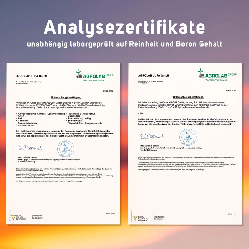 - Quality requirement: Each individual production of DiaPro Boron high dosage is also very strictly tested by an independent certified German laboratory for its unrestricted product quality and marketability. Only in this way can the highest quality be guaranteed. In the production of the DiaPro Boron 3mg product, preservatives, release agents, flavours as well as lactose and gluten are deliberately avoided. DiaPro Boron 3mg is, of course, GMO free.