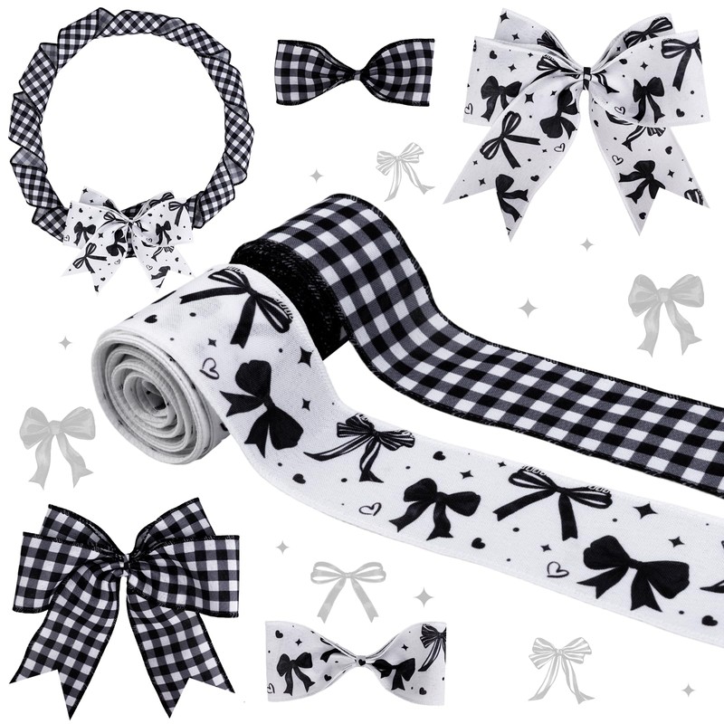 - Package includes: You will receive 2 rolls of black bow wired edge ribbons, and the 2 rolls of ribbons are in different style, including 1 x black bow ribbon in white base, 1 x black and white checkered ribbon, each ribbon measures 5 yards x 2.48 inches, totally 10 yards