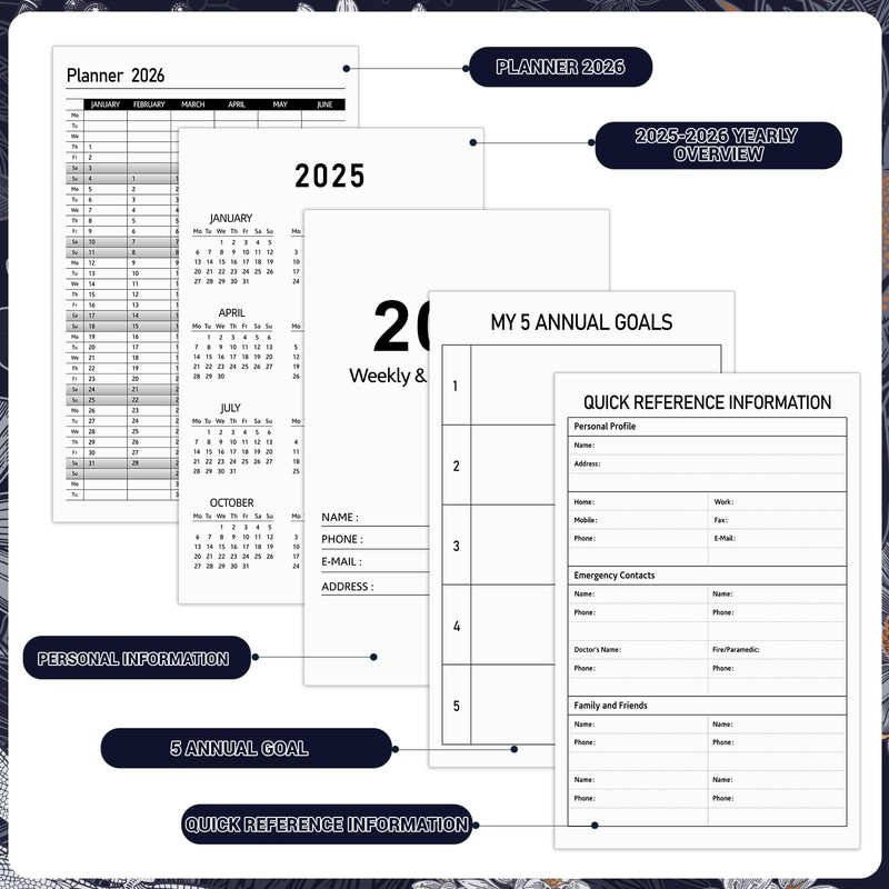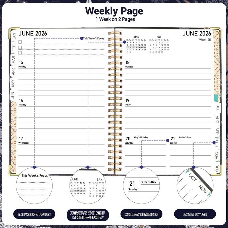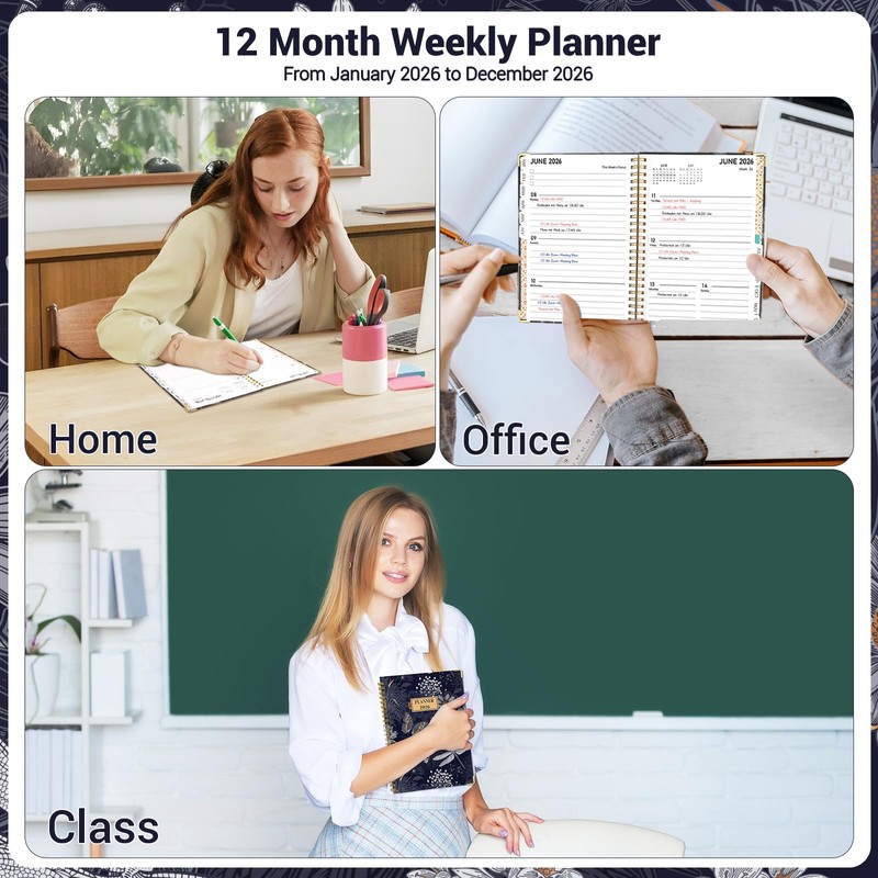 1. Stylish Design and Includes a full year: The weekly planner adopts a simple black design, and this planner begins Jan 2026 to Dec 2026, covering a whole year's work plan, study plan, daily plan, etc.