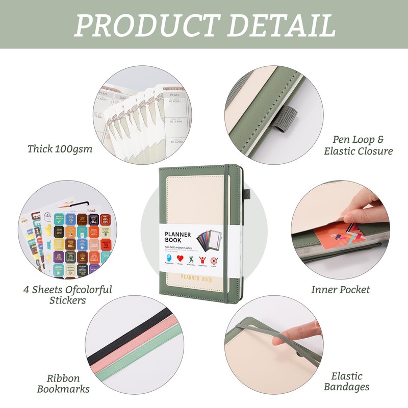 - Portable Appearance The weekly planner notebook with grid is equipped with tri-color bookmarks, which make it easy to mark and retrieve the pages you need. There is a pocket on the front that can store cards. The elastic band and side pen holder also make it more portable for you to wear.