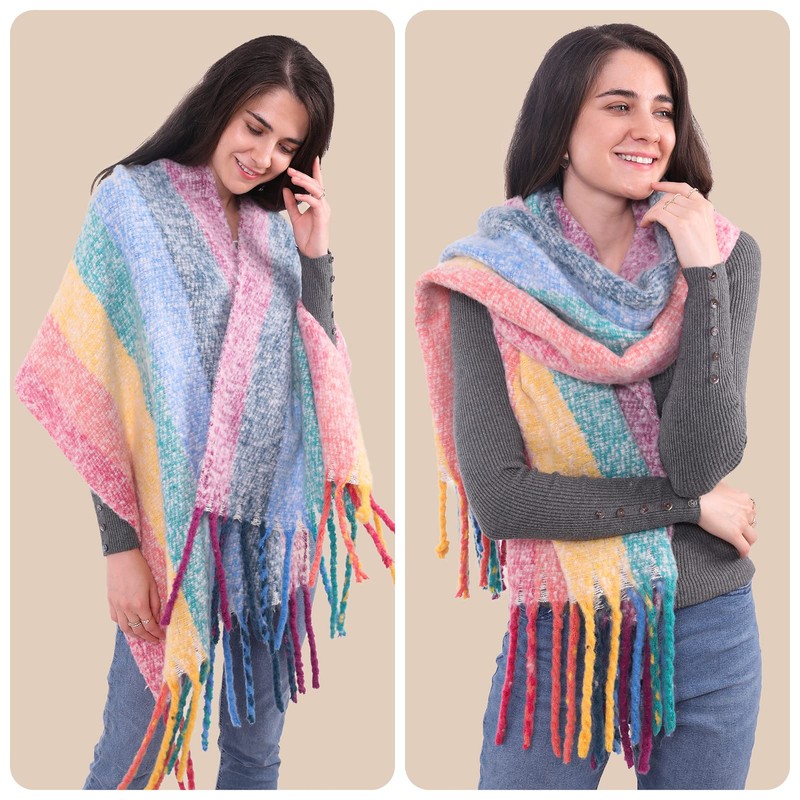 Designed to complement a variety of outfits, from casual wear to more formal styles, this blanket scarf features a classic check and rainbow block pattern. Picture yourself walking through the snow in the UK, with vibrant colours brightening up the winter landscape. Perfect for pairing with coats or jumpers, it’s a scarf for women that ensures you look fashionable wherever you go.