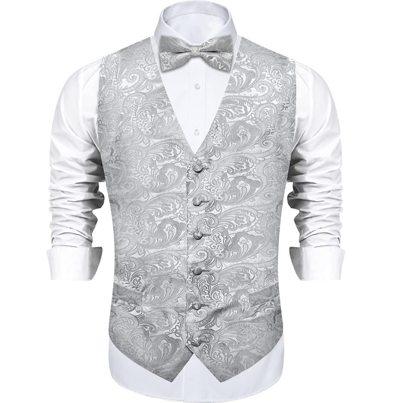 - 【CLOTHING MATCH】This silver paisley suit vest and bowtie set work well with your shirt,suit or tuxedo for the best-dressed look,suit for formal or informal occasion such as:wedding,banquet date,working,dating,party,prom, poliday leisure or daily wear for all seasons
