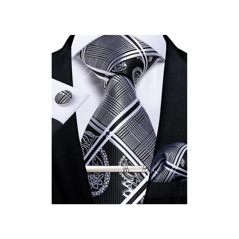 DiBanGu Silk Black Grey Paisley Necktie and Pocket Square Cufflinks Tie Clip Set for Men Formal Wedding