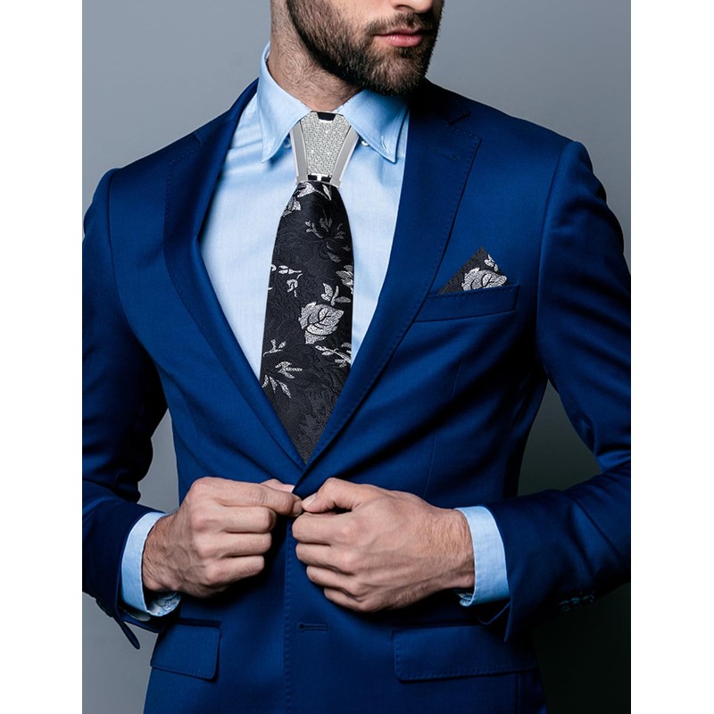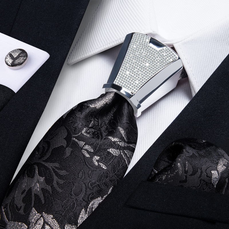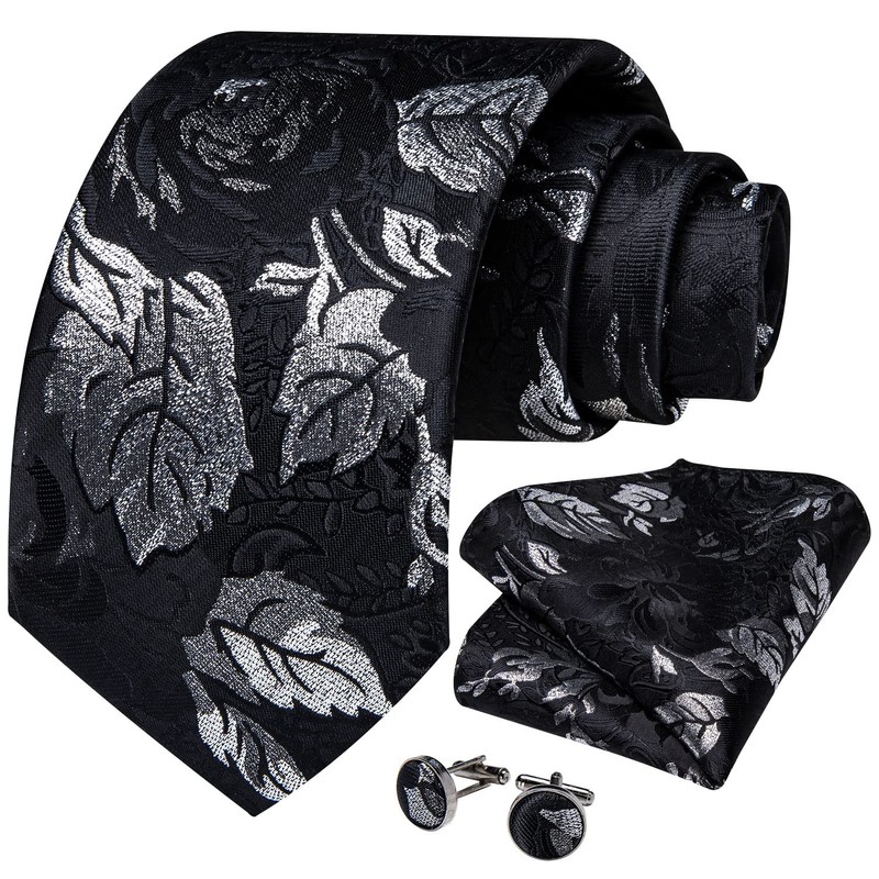 - 【Gift Set】1 Black and Silver Floral Tie, 1 Pocket Square, 2 Cufflinks and 1 Silver Shiny Tie Accessories and 1 Silver Gift Box; DiBanGu silk tie and handkerchief set is a great gift for Father's Day, Valentine's Day, Thanksgiving Day, Christmas, Halloween