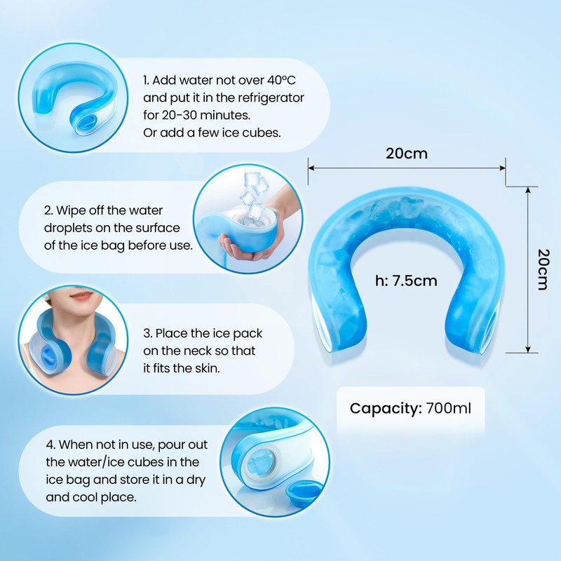 • 【Reusable & All-Day Cooling】: It can be refrozen after each use, allowing for multiple applications. You have the option to add ice cubes or water no warmer than 40°C.Alternatively, you can place the ice pack in the freezer for 20-30 minutes before use.