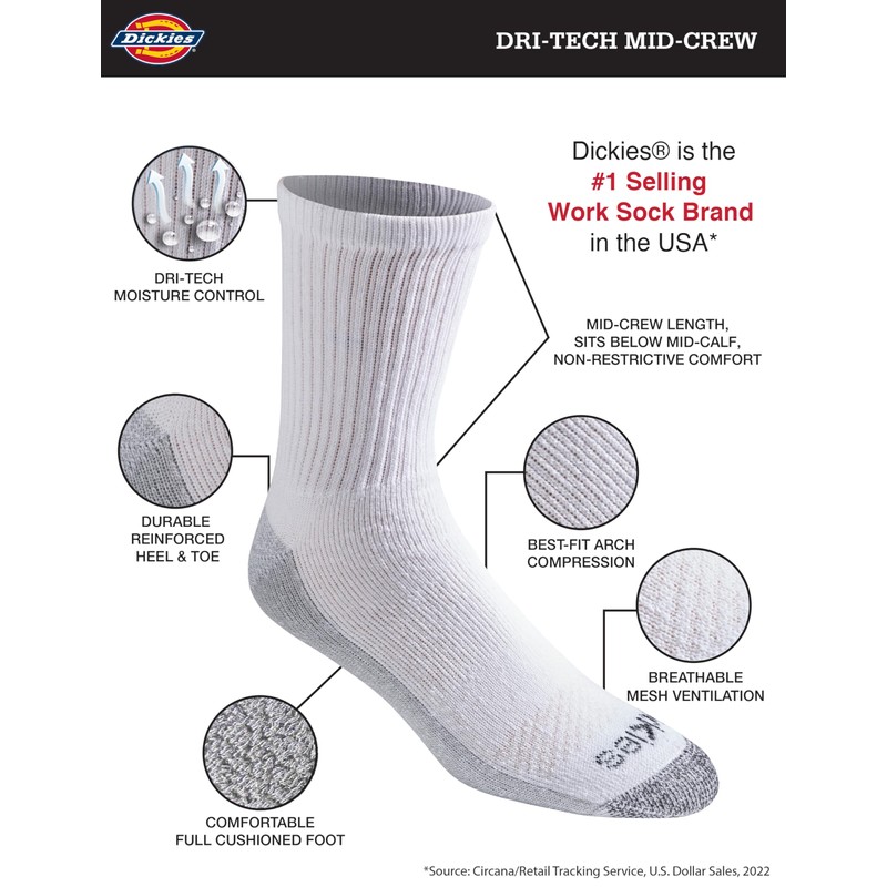 Dickies Men's Dri-tech Moisture Control Comfort Length Mid-Crew Socks, Comfort Length White (6 Pairs), X-Large