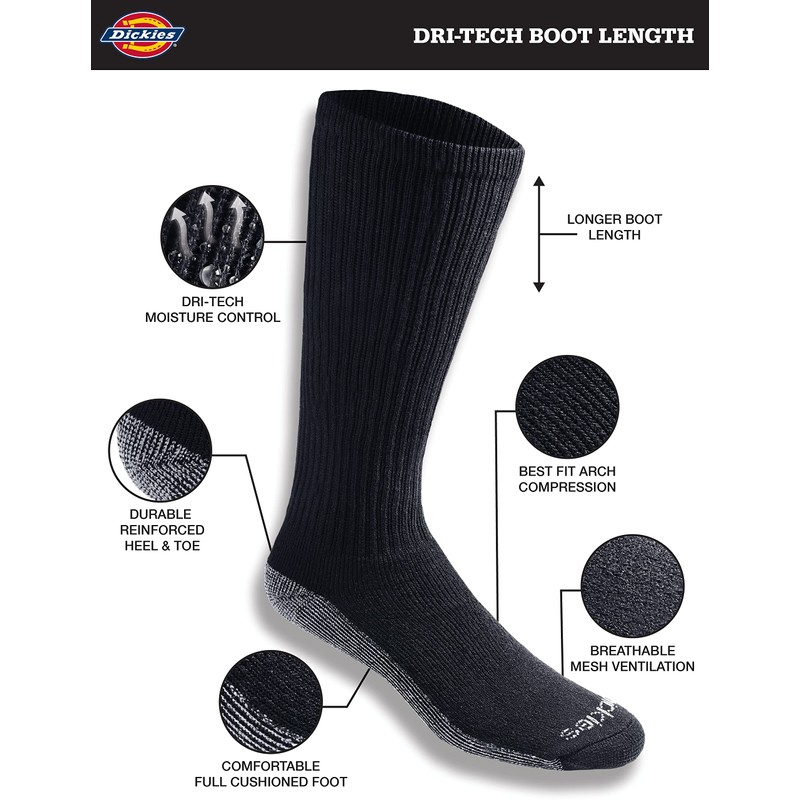 Dickies Men's Multi-Pack Dri-tech Moisture Control Boot-Length Socks, Black (6 Pairs), Shoe Size: 6-12